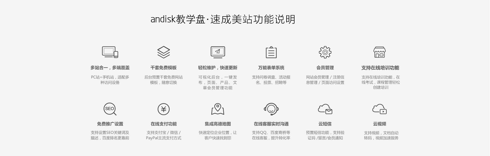 預(yù)置多套精美PC+手機(jī)的整站模板,覆蓋全行業(yè),涵蓋7大色系,后臺隨意切換。支持完整的在線培訓(xùn),在線考試,K12輔導(dǎo)功能。